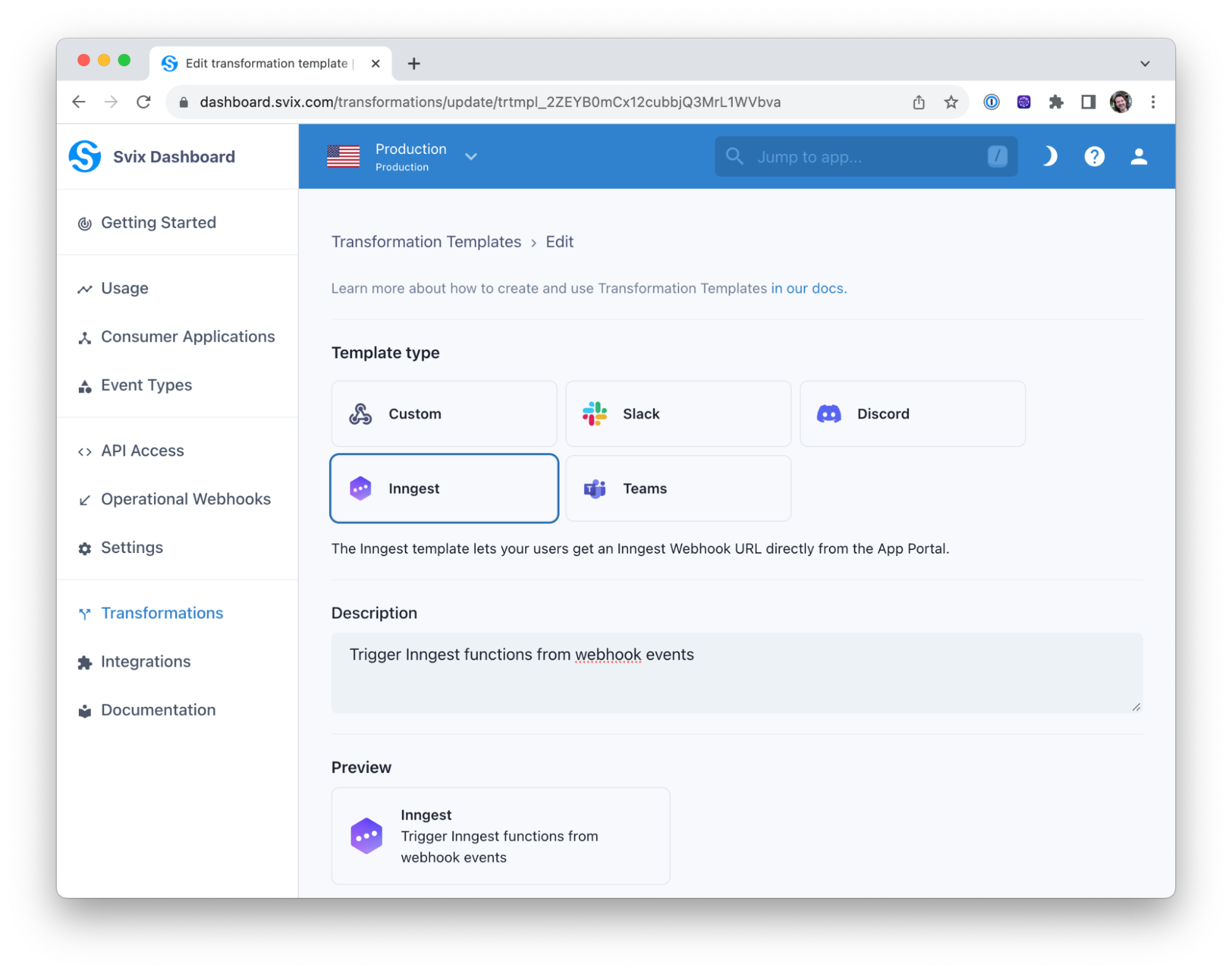 • Svix customers can now create a new Inngest transform template which will be visible in their App portal