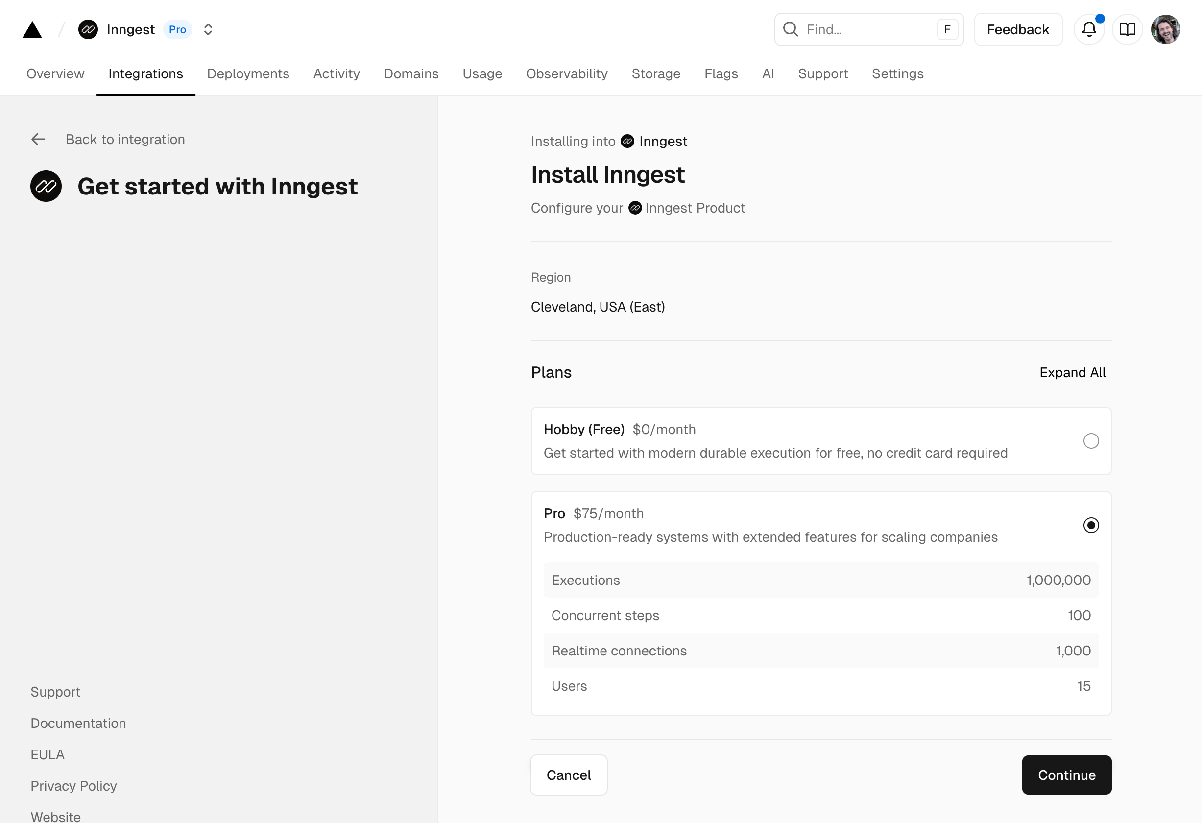 Next you'll be able to select the billing plan and the included usage for each plan (more info on our plans below). Here we've selected the Pro plan which starts at $75 per month with additional charges for executions above the included amount.