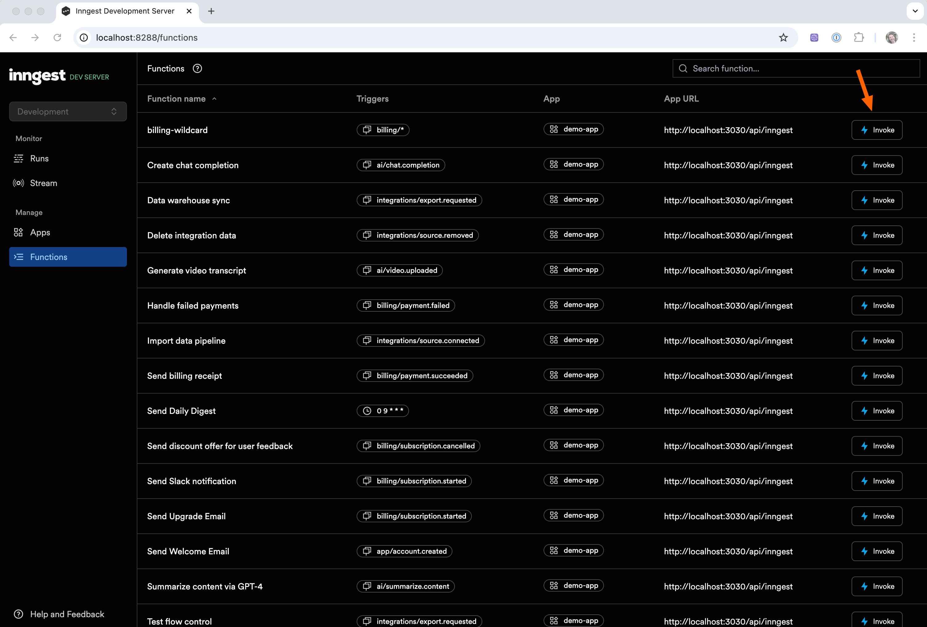 The dev server's interface also has a "Test Event" button on the top right that enables you to enter any JSON event payload and send it manually. This is useful for testing out different variants of event payloads with your functions.